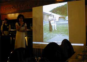 チェロの川崎さんの力作『あられの思い出』上映中。皆から集めた19年分のスライド。皆若い・・・・。