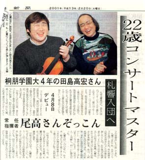 ニキティンさんが札響を辞めて東京交響楽団に行ってから約半年経ちました。その間菅野まゆみさんが一人でコンマスを務めていたのですが、4月からもう一人コンマスが加わります。田島高宏さんという人です。札響には8回ゲストコンマス、あるいはゲストアシスタントコンマスとして登場してます。招聘の楽員を迎えるときは通常のオーディションはないのでこの様にゲストで迎えて楽員の評価を確かめるのがだいたいいつものやり方です。田島さんは演奏も人柄もとても評価が高かったです。特に印象的だったのは12月定期のシュニトケのソロだったのではないでしょうか・・。(当HPの掲示板でも話題になりました)