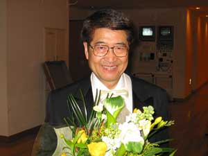 6月末をもってトロンボーンの真弓基教さんが定年退職になります。定期演奏会は18、19日が最後でした。真弓さんは1970年入団以来、首席トロンボーン奏者、定年時は副首席奏者を務め、35年に渡りセクションを支えてこられました。最後となった定期演奏会では指揮者の岩城さんに舞台中央に招き寄せられ、花束を受けとり、客席からの盛んな拍手に答えていました。写真は19日終演後にステージ上でのトロンボーン・チューバセクション。左から2番めが真弓さんです。また真弓さんは若い頃柔道家になりオリンピックを目指すか、芸大に進みトロンボーン奏者になるか迷ったという経歴の持ち主。体力も気力もまだまだ若者を圧倒する真弓さんが定年退職とは不思議な気がします。長い間お疲れ様でした。