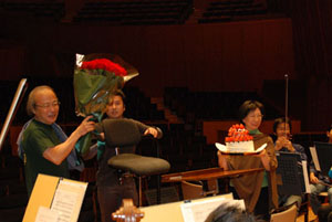 今日は尾高さんの60才の誕生日でした。練習の始りの恒例チューニングからハッピーバースデー演奏(ラから始るバージョン)に続いて、花束とケーキが一同から送られました。