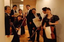 今月定期(10月19、20日)を最後にヴィオラの鹿島祥湖さんが定年を迎え退職します。鹿島さんは昭和55年入団より28年間在籍しました。鹿島さんの無事卒業を記念してヴィオラ・セクションが9人全員でロビーコンサートに出演しました(下の写真)。アンコールの「千の風になって」でソロを聴かせた鹿島さんに盛んな拍手がよせられました。また、演奏会終了後にはステージ上で指揮のマリナーさん直々に花束と、何と!両ほっぺたに”チュ”が送られました。札響のお母さん的存在が次々に定年を迎え淋しくなります。