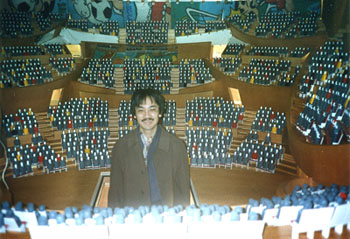さて、キタラの10周年にちなんで面白い写真をお見せします。下の写真はキタラ建設中の中島公園の一角に設けられたキタラの模型内部です。人物は10年前の私です。少し若いです。パイプオルガンの部分に小窓があって、そこから撮影してます。実物のキタラを見慣れた現在の目で見ると、この模型が実に良く出来ていた事が分かります。