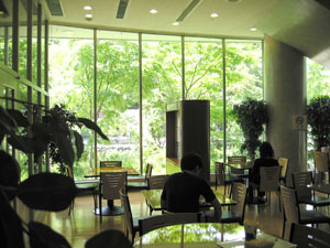 そして下のこ洒落たカフェのような空間はステージ裏のコーヒーラウンジです。ステージ裏も世界一居心地の良いホールです。ここでくつろいでいるとステージに出ていくのが億劫になります(笑)。新緑の季節は特に良いです。
