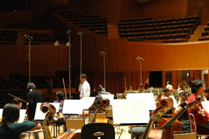 録音作業は一楽章ごとに、まずは2〜3回止らずに演奏したものを撮り、その後は指揮台の横に置かれた電話でモニター室のプロデューサーから駄目出しが入ります(英語で)。それを尾高さんが、「153小節目が合っていなかったと言っています」とか何とか言いながら、細かく撮りなおしていきます。この手順で1楽章撮るのに大体2時間かかります。静かな部分でのごく僅かなノイズも撮りなおしの対象になります。交響曲1曲撮りおわってモニター室から「オッケー」が出ると、オケ全体から安堵とも何ともつかない溜め息が漏れました。