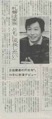 今日、第402回定期演奏会が開かれました。常任指揮者の尾高忠明さんの就任披露演奏会になりました。定期の場合練習は演奏会の前3日間行われるのですが、とても熱のこもったものでした。メインのプログラムにはR・シュトラウスの英雄の生涯が演奏されました。就任披露と昨日の秋篠宮殿下の見学もあり、今回の定期はマスコミが毎日の様に入り華やいでました。今日の北海道新聞夕刊に尾高さんと正指揮者に就任した円光寺さんの記者会見の模様が出てました。また昨日のNHKの6時のニュースでも札響の練習風景と尾高さんのインタビューが放送されました。