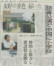 昨日の新聞で知ったのですが、札響バイオリン奏者の石川さんがチャリティーコンサートの売上金で、中国雲南省の貧しい村に小学校を建てました。石川さんは中国から来た人で、中国中央歌劇院のコンサートマスターをしていた人です。雲南省の小学校は水害で校舎が崩壊したままだったそうで、石川さんの寄付金が再建費用の75%を占めたそうです。