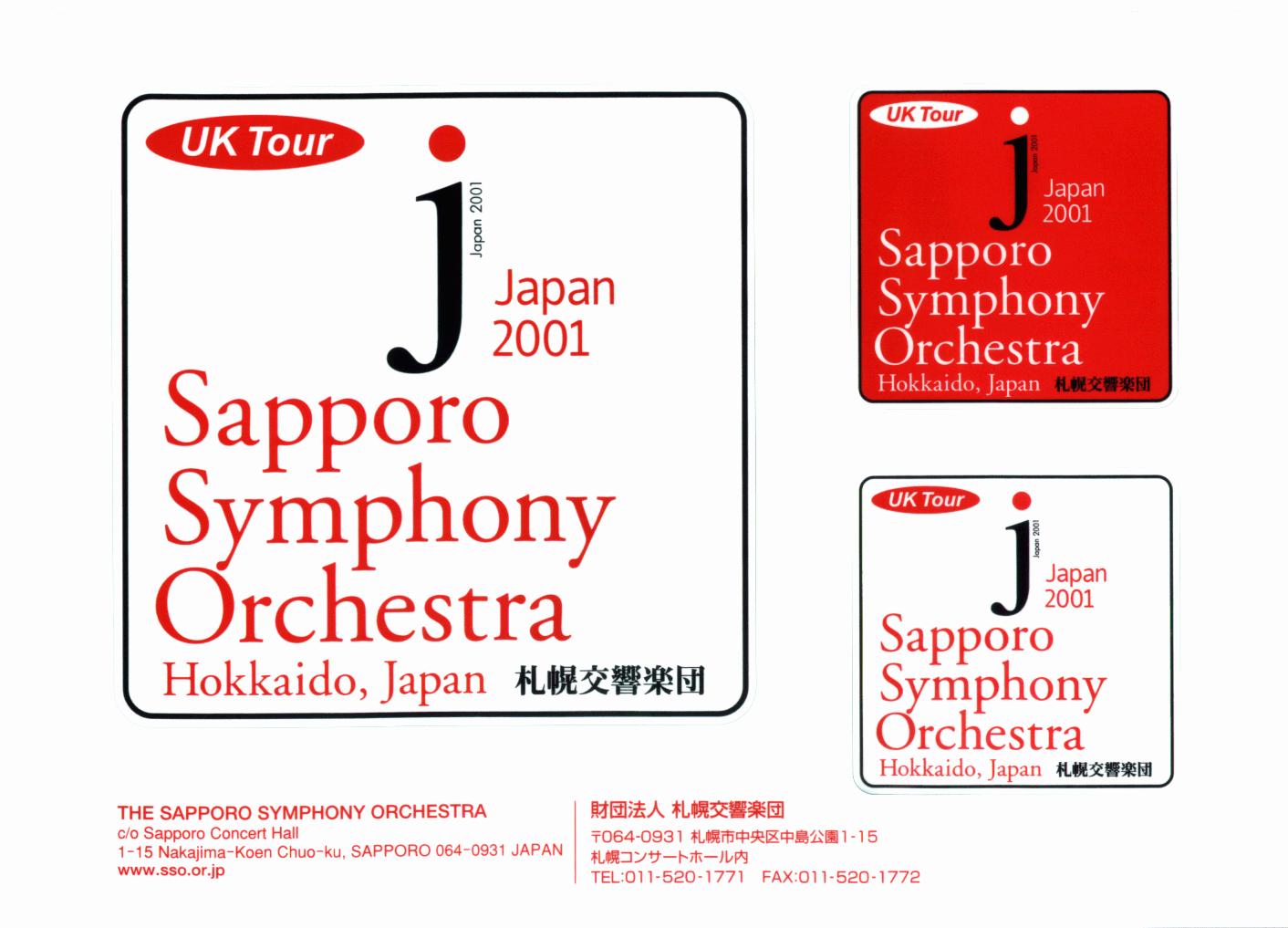 上のシールはUKツアーのときに楽器のケースやスーツケース、また団所有の楽器や衣装用ケースなどに貼るために作られたものです。楽員にはひとり3枚づつ配布されました。”札響グッズ”としてオリジナルのものが一枚300円でオフィシャルHPや事務局で売られています。 上の画像をクリックすると解像度の高いGIF画像に飛びます。220kbあります。解像度は150dpiにしてありますので、右クリック「画像を名前を付けて保存」でダウンロードした後、お持ちのレタッチソフトの解像度を150dpiに設定するとオリジナルと同じ大きさでプリントできます。まがい物でも構わないと言うかたは(笑)インクジェット用光沢シール紙などにプリントアウトしてハサミで切り抜いて鞄などに貼って遊びましょう。