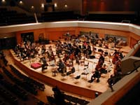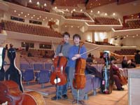 リハーサル直前の札響。ホールはアリーナ式です。キタラより二周りほど小さいです。キャパは調べていませんがみたところ1500〜600といったところでしょうか。 舞台側から見た客席。写真左はチェロの角野さん、右は私。リハーサルの前は舞台上にみんな乗るとうるさいので、このように客席で練習してたりします。