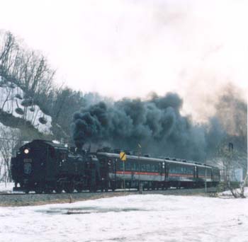 駅を出たばかりなので黒煙をもうもうと上げている。このあたりはまだ灰色によごれた雪が沢山残っていた。