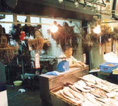 まず初日、初めていく私のために明石にある魚の棚という魚屋ばかりの商店街に買い出しもかねて連れて行ってくれました。ここはかなり驚きです。200メートルほどのアーケード街のほとんどが魚屋です。 北海道にはない珍しい魚が生きたままたくさん売ってました。 明石のタコは有名で、タコを売る店は沢山ありましたが、写真のタコ屋はひときは目を引きます。タコを乾燥させて凧みたいにしたのを売ってました。(ちょっと写真では分かりにくいかも) |