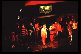 3月29日札幌のキング・ムーというディスコで、FMノースウェーブの「NEW DAY COMMING INKING XMHU」という催しがあり、SOUPがゲストで出演したので行ってきました。ノースウェーブのDJが総出演して新番組の抱負を述べるというのが主なコンセプトだったのでDJ狙いの客が多かったようです。ライブゲストはSOUPの他にLailaが出ました。それとスペシャルゲストに富樫明生、そしてアブソルートアワーでSOUPの荒木と富樫明生が募集していた「だっつーのズ」のお披露目もありました。SOUPや「だっつーのズ」のライブが始まると、去年キングムーに2,000人集めたSOUPライブの異常な盛り上がりには遠く及ばないものの、それでもかなり盛り上がりました。でもやはり客のリアクションやPAの音作りの点で不満は多々残り、はやくまたライブやってくれー!と思いました。 左の「絵」、上はSOUPのミニライブ、下は「だっつーのズ」。下の「絵」の中心は富樫明生。 |