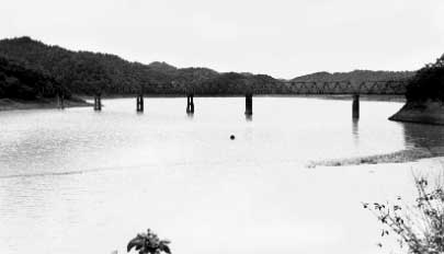 沿線のシュウパロ湖にかかる旧大夕張鉄道の鉄橋。なかなか美しいです。(白黒) |