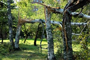 倒れた白樺が公園の遊歩道とベンチを塞ぐ。この木は文字どおり根こそぎ倒れた。