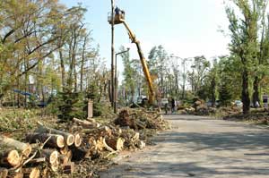 クレーンで倒壊の恐れのある木を除去している。歩道脇には伐採された木が積まれている。市内のいたるところで見られる風景。