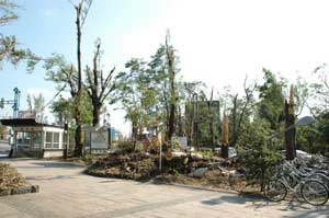 この惨状、札幌の人は皆知ってるので、いまさら敢えてここに書くのも何ですが、東京方面の人も当HPを見てくれてるみたいだし、敢えて書きます。酷いです。美しい並木がまるでゴジラが通った後みたいになっているのを見るのは悲しいです。胸が潰れる思いです。「台風ってさ、なんかワクワクするよね〜〜〜〜」とかってもう絶対言いません。ごめんなさい。神様許してください。