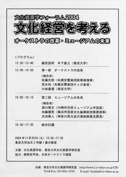 わたしの次には助教授の小林真理さんという方が、オーケストラの(経営上の)各国比較などの話しをなさって、簡単な質問を受け付けて休憩。後半はミュージアムのパネリストの発表でした。パネリストは川崎市民ミュージアム学芸員の深川雅文氏、横浜市芸術文化振興財団専務理事の加藤種男氏、神奈川県立近代美術館普及課長の太田泰人氏の3方でした。それぞれオーケストラとミュージアムの抱えている問題に共通点があり、参考になる話しだったのですが、なかでも川崎市民ミュージアムの深川氏のお話しは、一旦取り潰しもマスコミで取りざたされるほどの危機に陥りながらも、学芸員で作った組合で次々と斬新な改革案を出し、入場者を増やし危機を脱したというもので、大変共感できるものでした。
