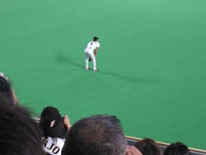 外野席(自由)のチケットは事前に買ってあったので、既に長蛇の列が出来てたのですが、並んで中に入りました。外野席のちょうと新庄が守るセンターの近くの前から数列目に陣取り、作法通りビールを飲みました。ビール売りのオネエサンが沢山歩いていて手を上げると、ささっと寄ってきて、それはそれは愛想よくビールを注いでくれます。そいえば、ビール売りのオネエサンだけでなく、会場の従業員たちは皆とても感じ良いです。安心して試合観戦を楽しめる雰囲気。これは見習わないといけないですね〜。