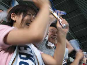 4回裏。逆転満塁ホームランを打った新庄に声援を送るチェロ奏者とホルン奏者。点数が入ったら、その選手の応援歌を歌い、♪おーいおーい北海道〜〜〜、の歌を振り付きで歌うのが作法のようでした。もちろん私も歌いました。作法は大切ですからね。