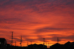 コンビニのある商店街を通り抜け、毎日自転車で大学に通った道を懐かしく噛み締めながら、当時住んでいたワンルームマンションに向かう。東京外環道路が出来て、どうやら草加インターから国道4号に抜ける道になってしまったらしく、交通量が激しい。信号まで出来ているものの、よくパンク修理に行った自転車屋もそのまま。わたしの住んでいたワンルームマンションも古くはなっているもののあった。このマンション。一回が不動産屋になっていて家賃は毎月この不動産屋に払っていた。外から覗いてみたが、受け付けの女性、商談をしているおじさんも15年分老けただけでそのままいた。懐かしさに思わず訪問したくなったが、やめた。彼らにしてみれば15年も前に大学生だった男に訪問されたとて迷惑かもしれない。覚えてくれているとも思えない。こっそりと建物の写真を撮ってその場を辞した。建物の写真を撮った頃はちょうど日没で、西側の空が見事に茜色に染まっていた。
