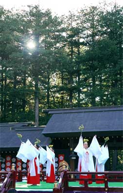 本殿内ではちょうど奉納舞が演じられていました。雅楽の生演奏付きで3つほど演目がありました。「職員による」とアナウンスがありましたが踊りも演奏も雰囲気もあり上手でした。奉納舞の他にも山車など色々奉納行事があるようです。奉納舞をゆっくり見物して、フランクフルトを食べて帰ってきました。